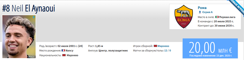 Нейл Эль-Айнауи выступает за «Рому» с лета 2025 года. В сезоне он провел 26 матчей, забил один гол и сделал одну результативную передачу.