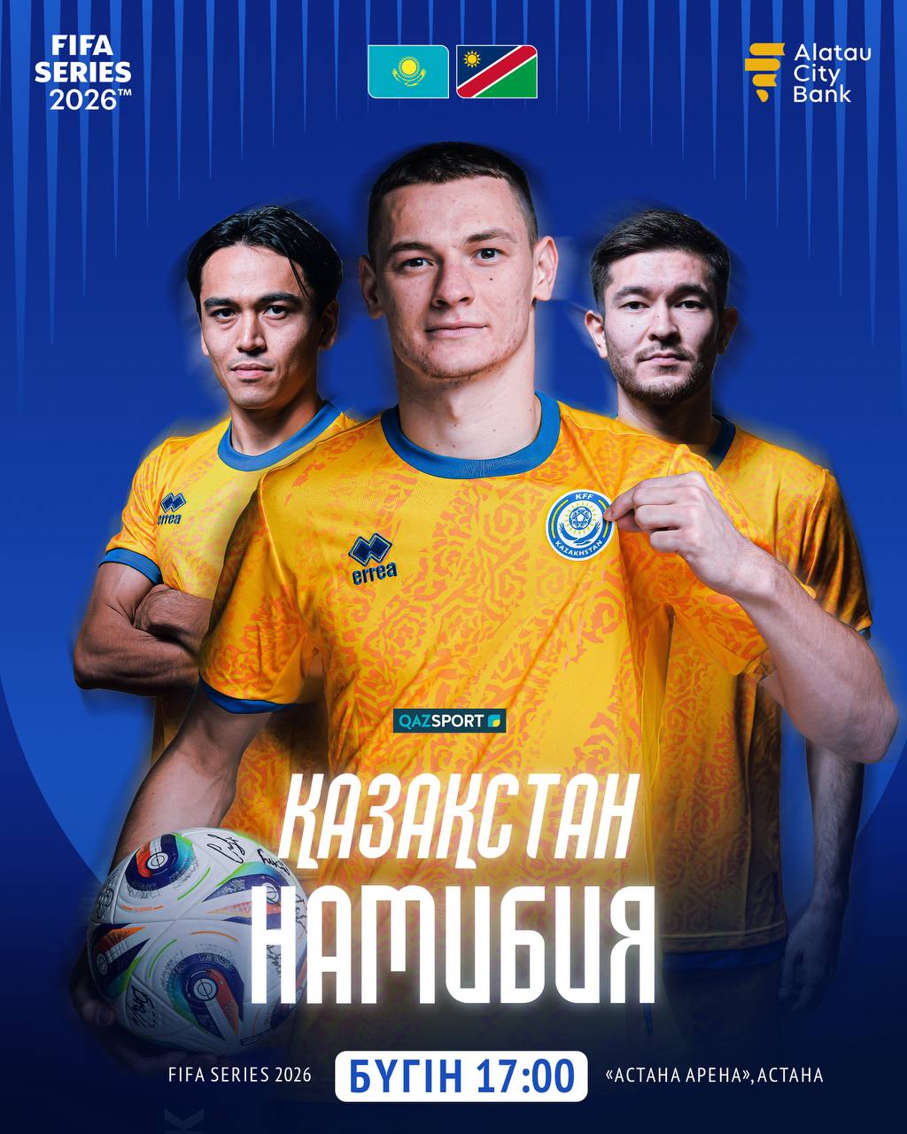 Первый матч турнира FIFA Series с участием сборной Казахстана против Намибии пройдет 25 марта в Астане. Прямая трансляция начнется в 17:00 на телеканале QAZSPORT и онлайн-платформе «Кинопоиск».