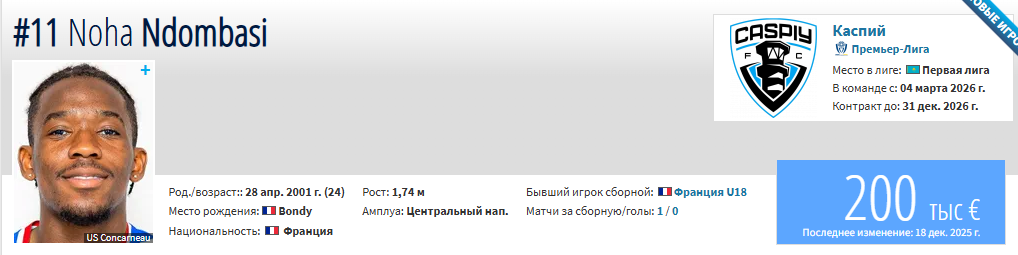 «Каспий» усилил состав 17 новичками, среди которых выделяется 24-летний форвард Ноа Ндомбази из «Кривбасса».