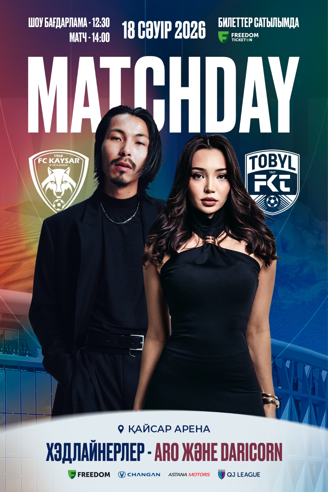 18 апреля на «Кайсар Арене» пройдет юбилейный матч Лиги между «Кайсаром» и «Тобылом» с шоу-программой, выступлением артистов и активностями для болельщиков.