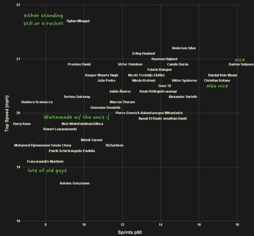 На сравнительном графике видно различие стилей ведущих форвардов. Килиан Мбаппе, Андерсон Силва, Эрлинг Холанд и Расмус Хёлунд быстрее Сатпаева по пиковой скорости.