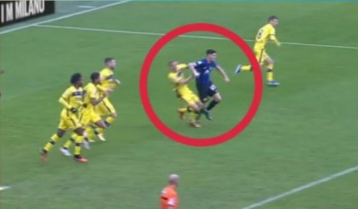 Удар Бастони локтем игрока Вероны. Скриншот из трансляции.