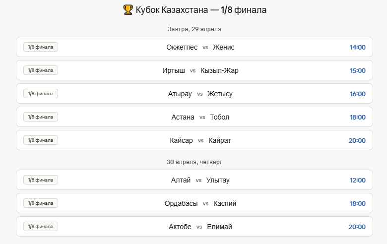 Матчи стадии 1/8 финала Кубка Казахстана состоятся в течение двух дней и пройдут в формате одного матча на вылет.
