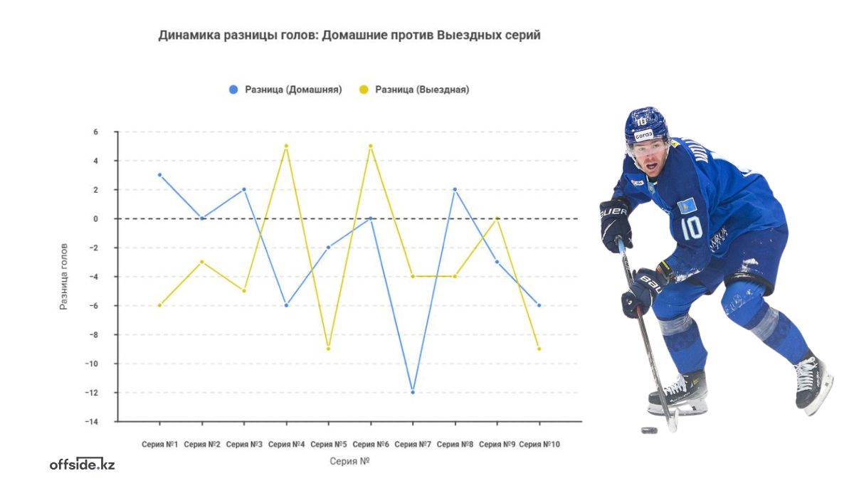 Особенно показательны отрезки, где оборона позволяла соперникам забрасывать 13-16 шайб за серию. В таких условиях даже относительно неплохая результативность не спасала ситуацию. К примеру, в десятом игровом отрезке (игры против «Салавата Юлаева», «Металлурга», «Сибири») «Барыс» забросил семь шайб, но пропустил шестнадцать – разница, которая практически не оставляет шансов на успешную серию.