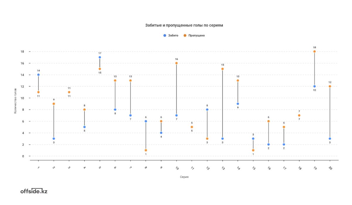 Вторая – более частая линия, где пропущенные шайбы превышали забитые. Именно эта траектория постепенно стала определяющей. Чем дальше продвигался чемпионат, тем чаще разрыв между атакой и обороной оказывался не в пользу астанинского клуба. Где после 12-й серии начинается устойчивый перекос в сторону пропущенных.