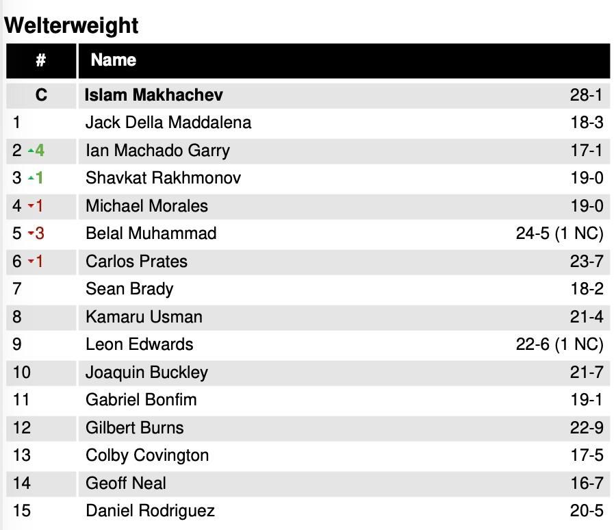 После прошедшего турнира в Дохе UFC обновил рейтинг бойцов в полусреднем весе, передает Offside.kz.