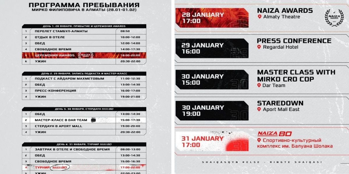 Приезд Мирко Филиповича — событие исторического масштаба для казахстанского единоборства. Боец, который крайне редко покидает Хорватию для участия в зарубежных промоушенах, согласился на визит благодаря усилиям давних партнеров казахстанского спорта — советника Посольства РК в Хорватии Ивицы Пирича и международного менеджера Владимира Рибича.