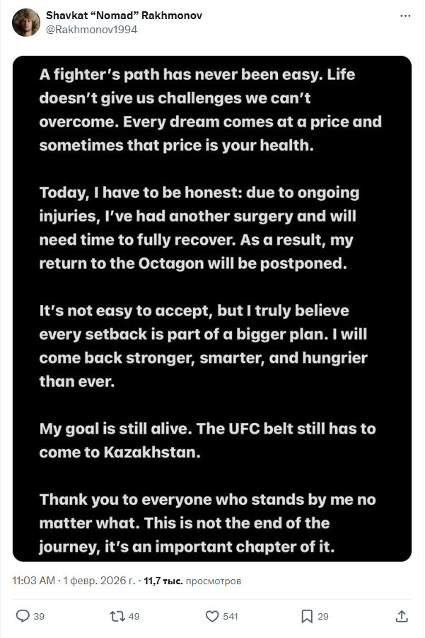 «Путь бойца никогда не бывает легким. Жизнь не дает нам испытаний, которые мы не смогли бы преодолеть. У каждой мечты есть своя цена, и иногда этой ценой становится здоровье. Сегодня я должен быть честен: из-за продолжающихся травм мне пришлось перенести еще одну операцию, и мне потребуется время для полного восстановления. В связи с этим мое возвращение в Октагон откладывается. Это нелегко принять, но я искренне верю, что каждый шаг назад - часть большего плана. Я вернусь сильнее, умнее и голоднее, чем когда-либо. Моя цель по-прежнему жива. Пояс UFC все еще должен оказаться в Казахстане. Спасибо всем, кто остаётся со мной, несмотря ни на что. Это не конец пути, это важная его глава», – написал Рахмонов.