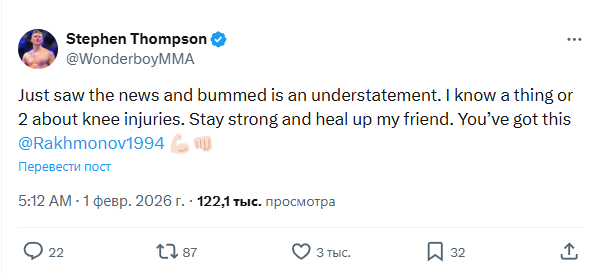 На своей странице в социальной сети X Томпсон выразил сожаление в связи с новостями о состоянии здоровья казахстанца. Американец отметил, что не понаслышке знает, насколько сложным может быть восстановление после повреждений связок колена. Стивен пожелал Рахмонову стойкости и скорейшего выздоровления, назвав Шавката своим другом и выразив уверенность в его успешном возвращении.