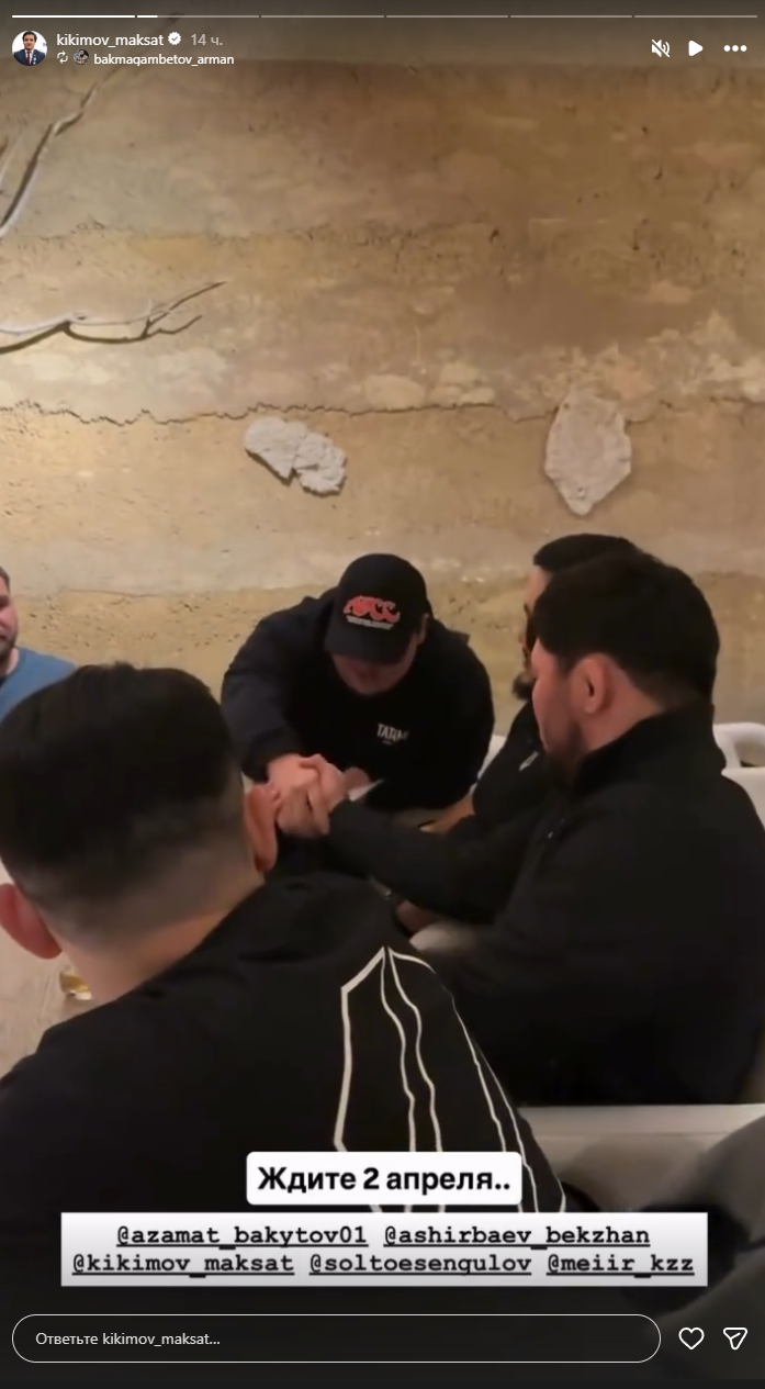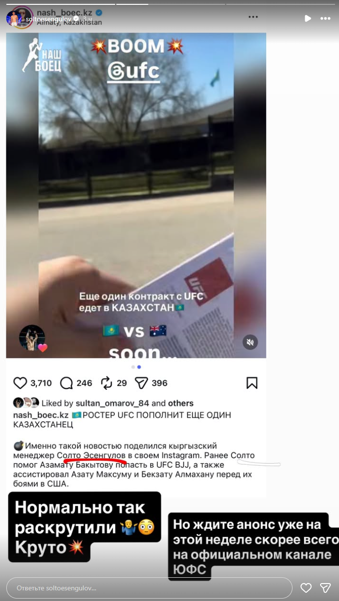 Президент Nomad Wrestling Максат Кикимов в комментариях сообщил, что знает имя бойца, который дебютирует в UFC в апреле, но раскрывать его не стал. В сторис Instagram Кикимов опубликовал короткое видео деловой встречи, на котором присутствовали Солто Эсенгулов, Азамат Бакытов и президент федерации бокса Алматинской области Бекжан Аширбаев.