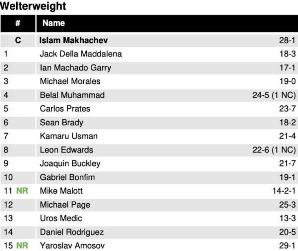 UFC объявил об изменениях в рейтинге дивизиона Шавката Рахмонова Канадский боец Майк Мэлотт (14-2-1) поднялся на 11-ю строчку рейтинга. В минувшие выходные он нокаутировал бразильца Гилберта Бернса (22-10) в главном событии турнира.