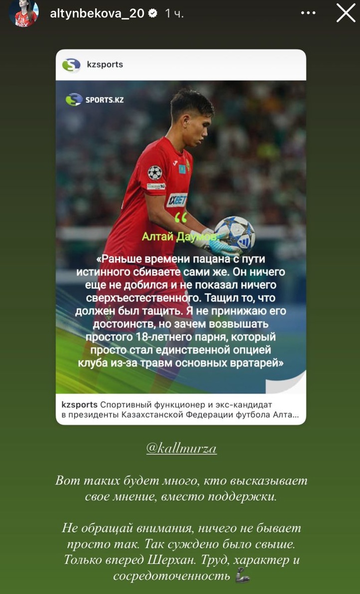 Волейболистка Сабина Алтынбекова не смогла смолчать, узнав мнение спортивного функционера Алтая Даумова о 18-летнем голкипере "Кайрата" Шерхане Калмурзе, передает Offside.kz.