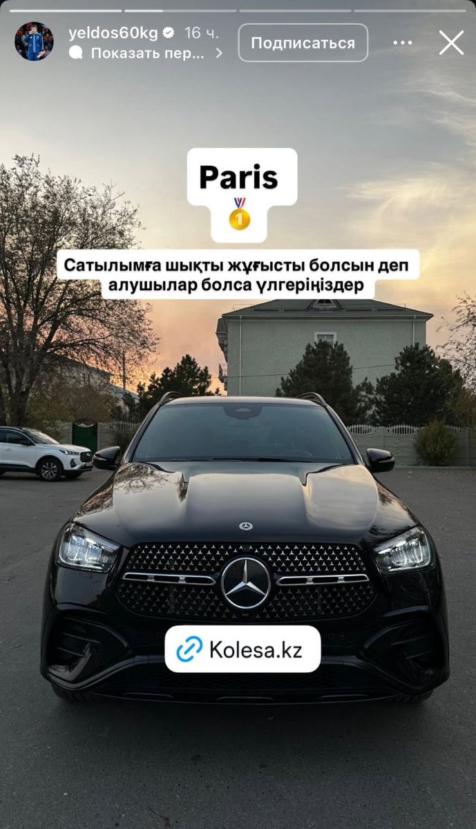 Олимпийский чемпион продаёт Mercedes AMG GLE, который он получил в 2024 году от крупного казахстанского бизнесмена Жумабека Жаныкулова, супруга медиа-персоны Динары Сатжан. В тот же день аналогичные автомобили подарили призёрам Олимпиады Нурбеку Оралбаю и Назым Кызайбай.