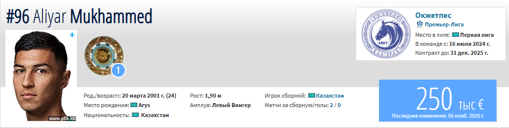 Стоимость трансфера игрока на Transmarkt оценивается в 250 тысяч евро, или 150,7 млн тенге.