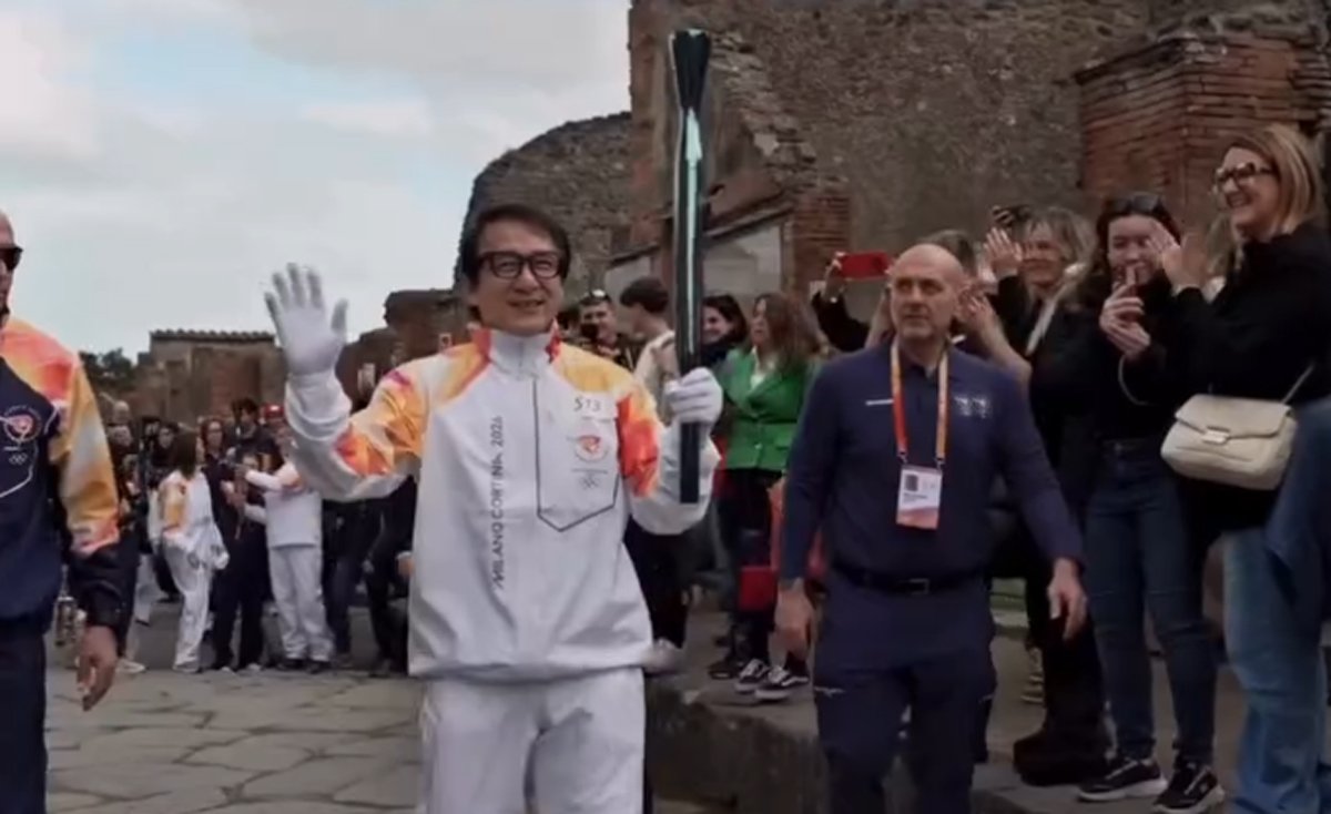 В рамках эстафеты огня зимних Олимпийских игр 2026 года в Милане и Кортине-д'Ампеццо Джеки Чан пронес факел по территории археологического парка Помпеи.