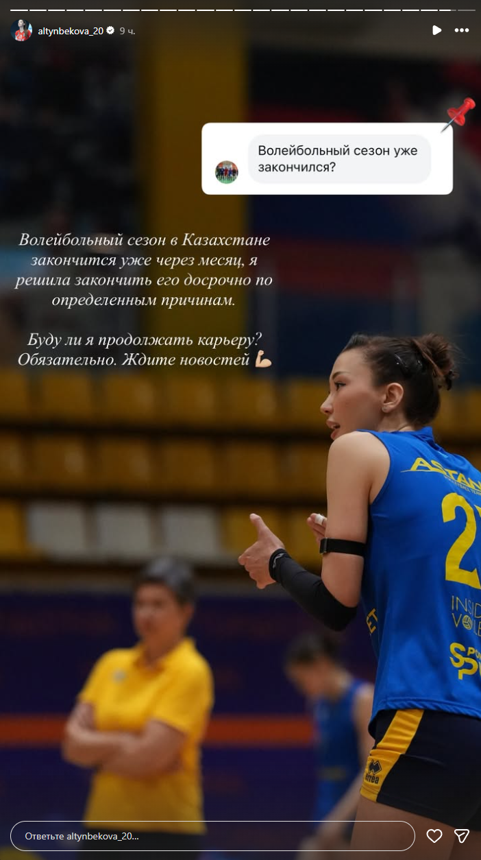 «Волейбольный сезон в Казахстане закончится через месяц. Я решила его закончить досрочно по определенным причинам. Буду ли я продолжать карьеру? Обязательно. Ждите новостей», – написала спортсменка в сторис Instagram.