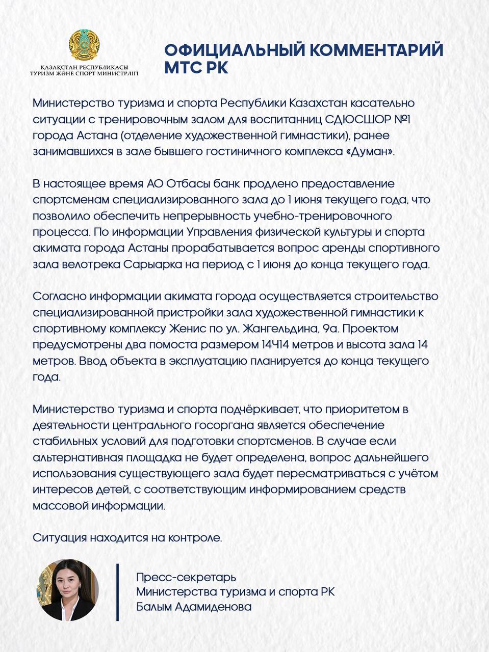 Министерство туризма и спорта РК соотчиталось о ситуации с тренировочным залом для воспитанниц СДЮСШОР №1 Астаны (отделение художественной гимнастики), ранее занимавшихся в зале бывшего гостиничного комплекса «Думан».