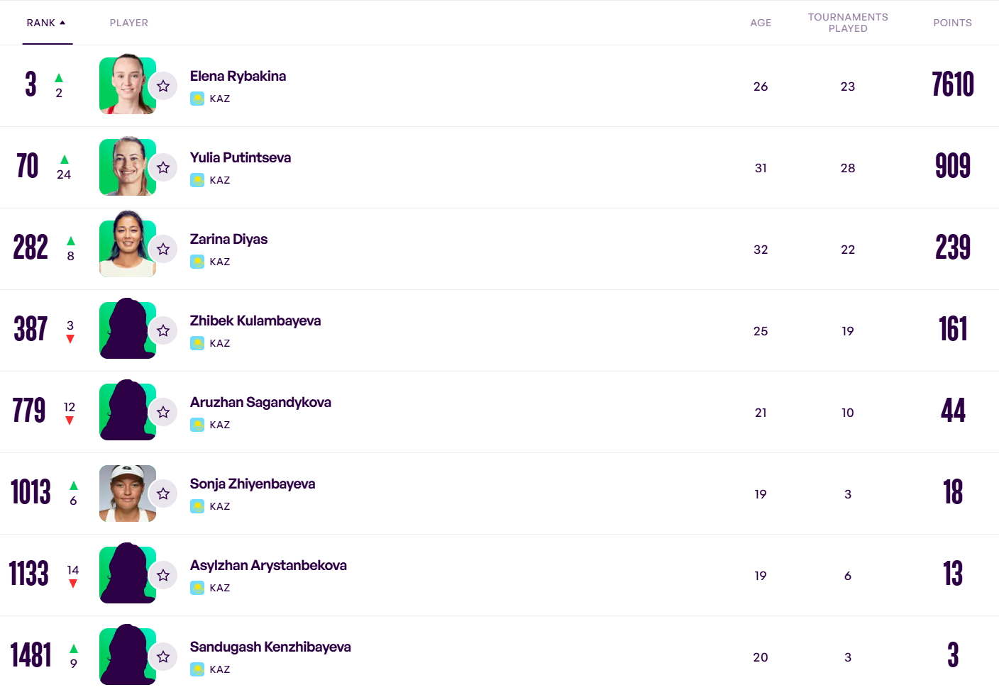 Юлия Путинцева занимает 70-е место в рейтинге с 909 очками, поднявшись на 24 позиции. 31-летняя спортсменка провела 28 турниров и остается второй ракеткой Казахстана.
