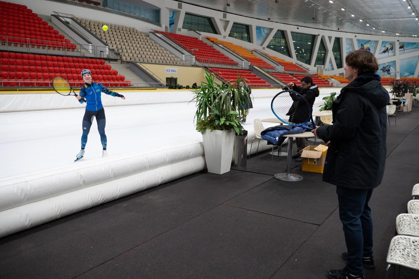 Скатов показал теннисную технику на льду, а шорт-трекисты попробовали свои силы в игре с ракеткой. Тимофей пожелал коллегам успехов на предстоящих зимних Олимпийских играх в Италии.