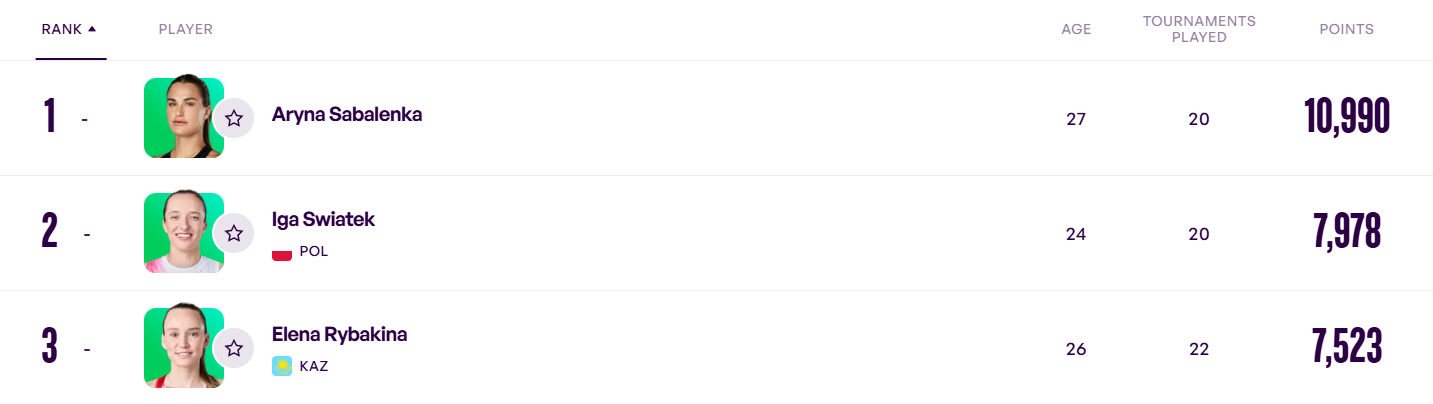 Первое место по-прежнему занимает представительница Беларуси Арина Соболенко. Второй остается польская теннисистка Ига Швёнтек. Третью строчку удерживает казахстанка Елена Рыбакина.