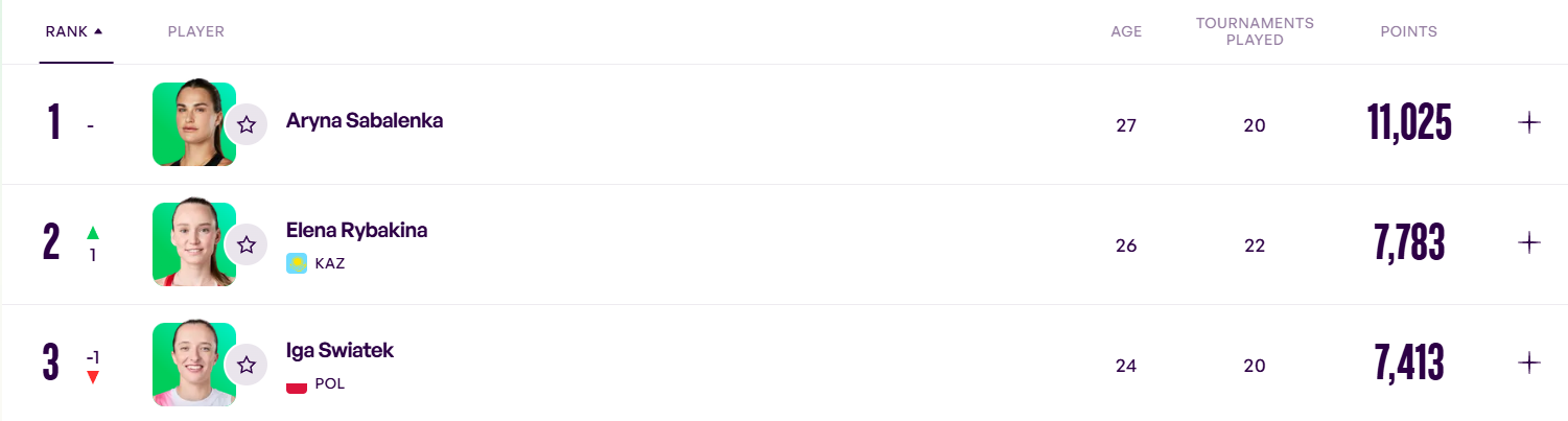 Лидером рейтинга остаётся представительница Беларуси Арина Соболенко, которая обыграла Рыбакину в финале турнира в Индиан-Уэллсе. Польская теннисистка Ига Швёнтек опустилась на третью позицию.