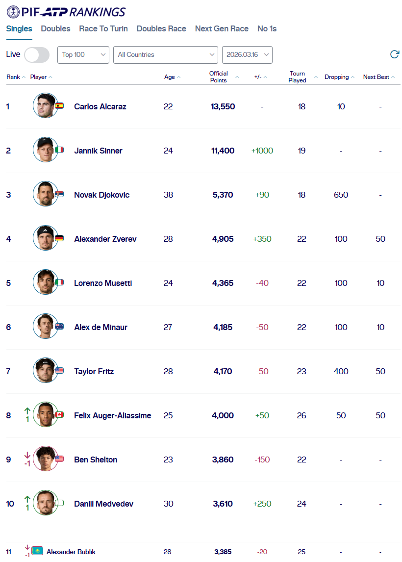 Первое место сохранил испанец Карлос Алькарас. На вторую строчку поднялся победитель турнира в Индиан-Уэллсе, итальянец Янник Синнер. Третьим остаётся серб Новак Джокович.