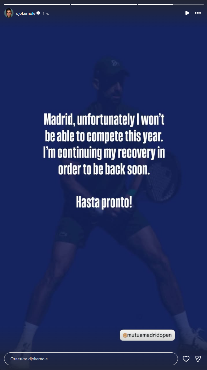 «Мадрид, к сожалению, я не смогу участвовать в турнире в этом году. Я продолжаю восстанавливаться, чтобы скоро вернуться», – написал теннисист.
