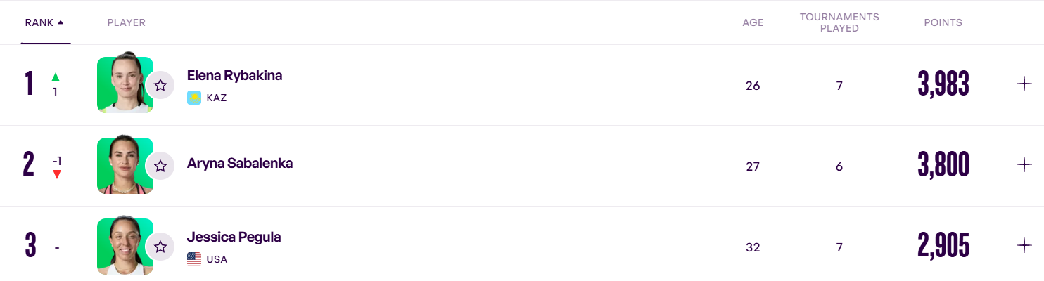 В обновленном рейтинге WTA Race Рыбакина набрала 3983 очка и сместила с первой позиции белоруску Арину Соболенко, у которой 3800 баллов. Третье место занимает представительница США Джессика Пегула с 2905 очками.